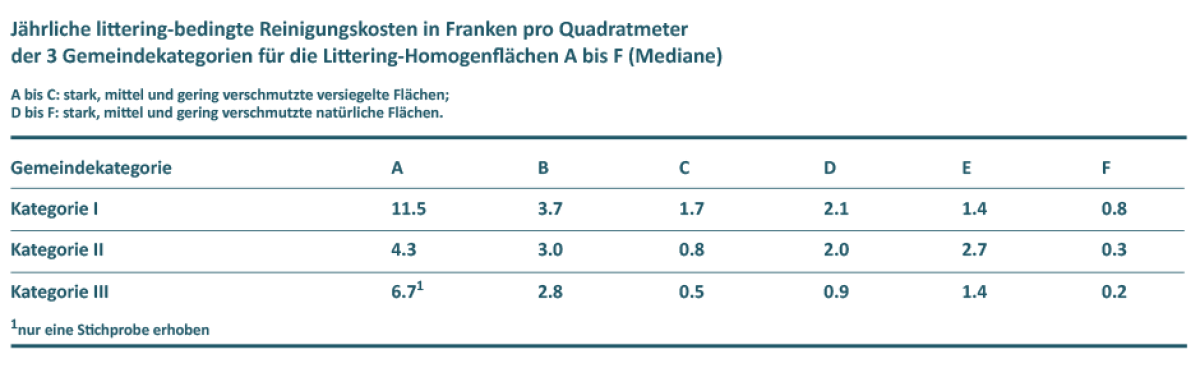 Für die untersuchten Homogenräume konnten je nach Littering-Belastung und der Bodenbeschaffenheit verschiedene mittlere littering-bedingte Reinigungskosten berechnet werden. Dabei wurden 6 Typen gebildet: versiegelte Flächen, die stark, mittel und schwach belastet sind (Typen A, B, C) und natürliche Flächen, die stark, mittel oder schwach belastet sind (Typen D, E, F). Die durchschnittlichen Quadratmeterkosten (Mediane) dieser Homogenraumtypen sind in nachstehender Tabelle aufgeführt.